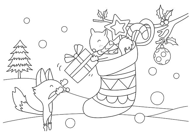 Un disegno di Natale da colorare per bambini e particolarmente adatto ai bimbi più piccoli che frequentano la scuola dell’infanzia. In questo disegno, uno scoiattolo decisamente a proprio agio nella grande calza colma di regali (forse lasciata da Babbo Natale) consegna un bel pacchetto di Natale a una volpe che sembra un po’ arrabbiata… ma che molto presto, sorriderà felice!