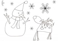Disegno di un pupazzo di neve con una renna Una renna di Natale con un grande pupazzo di neve. Un disegno tutto invernale da stampare e colorare. Cliccare sul disegno per stamparlo:
