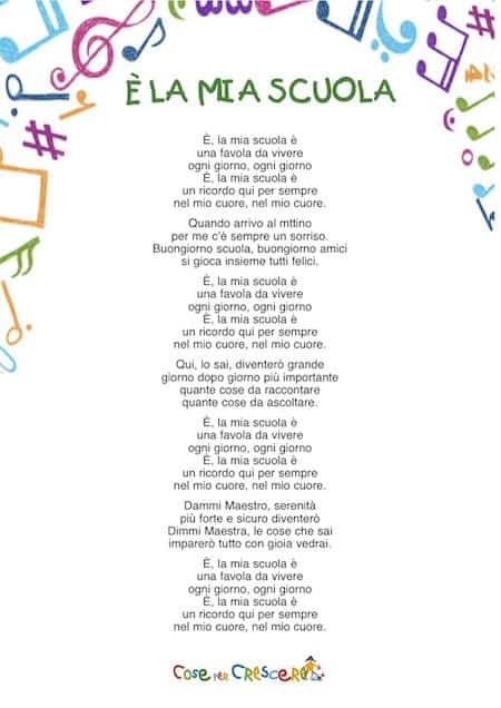 E’ la mia scuola è una canzone per bambini sulla scuola, una canzone di Dolores Olioso, adatta alla fine della scuola, per le classi della scuola primaria e per i bimbi più piccoli della scuola dell’infanzia. Una canzone che proponiamo nella versione da ascoltare, con un video tratto da Youtube, il testo da leggere online e il testo da stampare gratuitamente, per poterlo leggere, imparare e cantare tutti insieme.