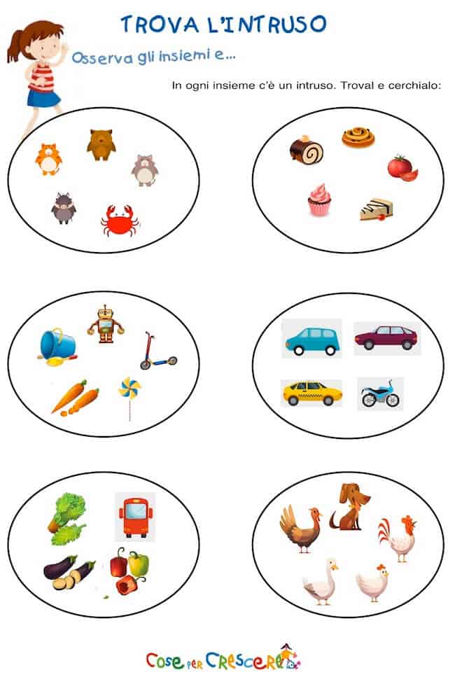In questa scheda, i bambini dovranno cercare l’elemento “intruso” in ognuno degli insiemi.