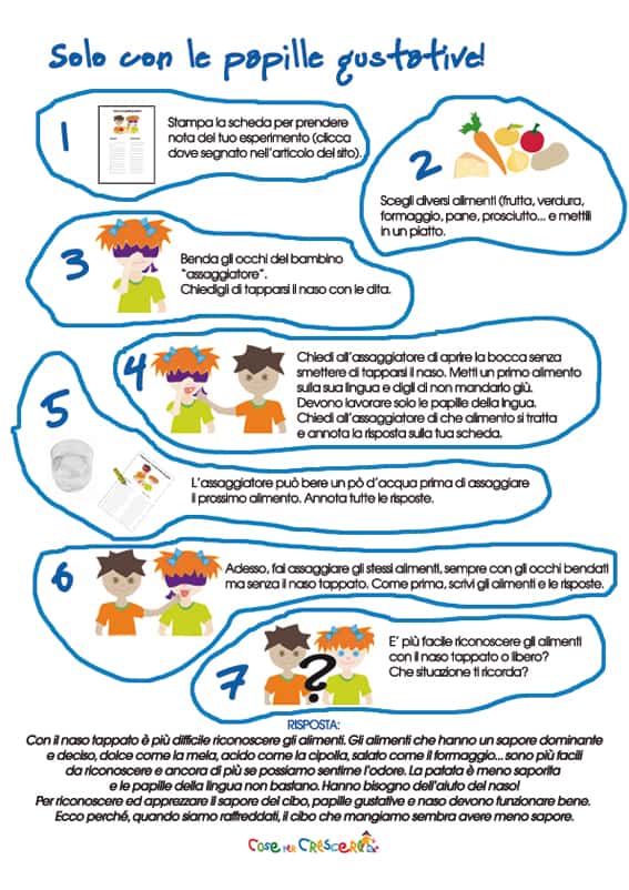 Questo semplice esperimento permetterà ai bambini di capire che non è solo la lingua a essere protagonista nel degustare i cibi ma anche il naso! Consultate la nostra rubrica sul gusto.