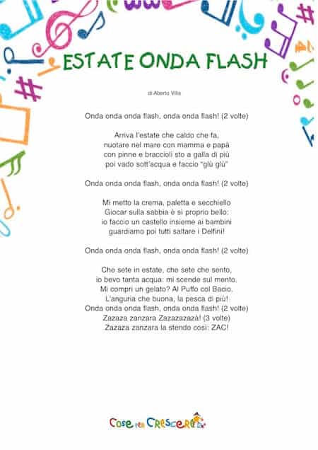 Una canzone per bambini sull’estate, una canzone di Alberto Villa e tratta dal CD “Bella lì”. Abbiamo preparato sia la canzone “Estate onda flash” da ascoltare che il testo da stampare gratuitamente, in modo da poterla imparare e cantare tutti insieme!