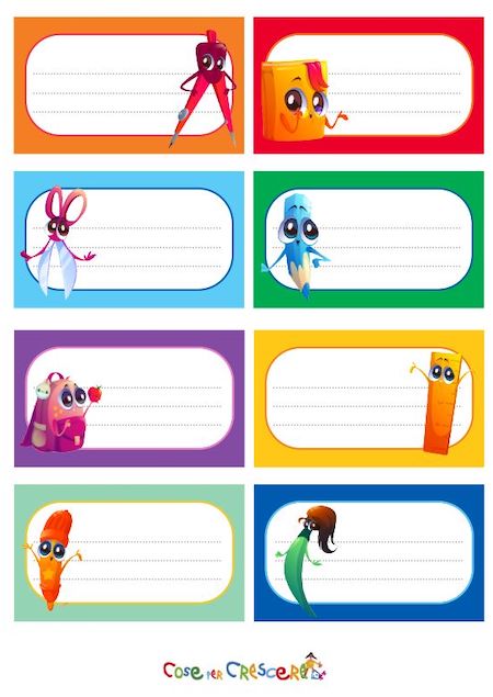 Una serie di etichette per la scuola da stampare gratuitamente. Etichette adatte ai bambini della scuola primaria e perfette per personalizzare libri e quaderni, tutte da incollare o da inserire nell’apposito spazio delle copertine. Otto etichette, ognuna con un disegno e un colore diverso, tutte sul tema della scuola. Ogni etichetta è illustrata con un personaggio che potrebbe stare nell’astuccio di ogni alunno e studente: compasso, pennarello, matita, righello, forbici, pennello, oltre ad un simpatico zaino e ad un bel libro!