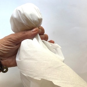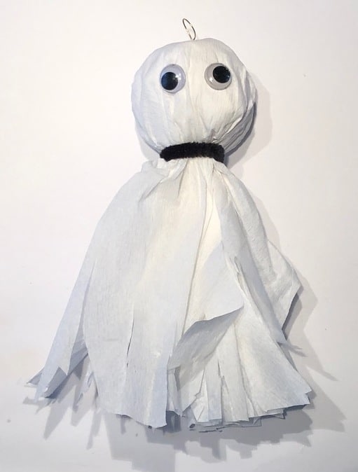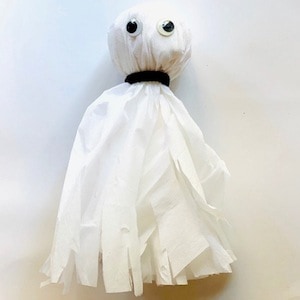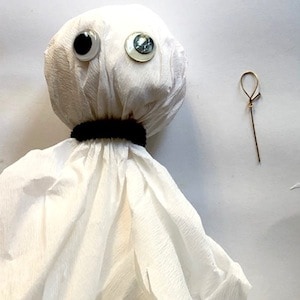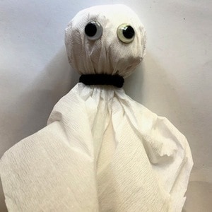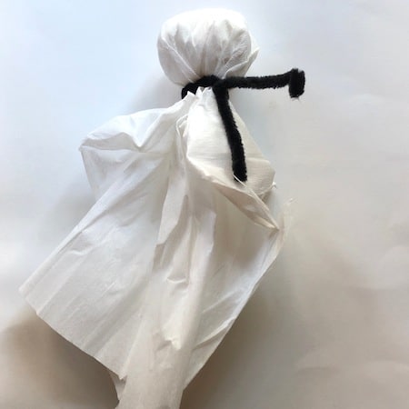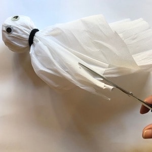 Mettere la pallina di ovatta al centro del foglio di carta crespa e avvolgere la carta intorno a quella che sarà la testa del nostro fantasma.