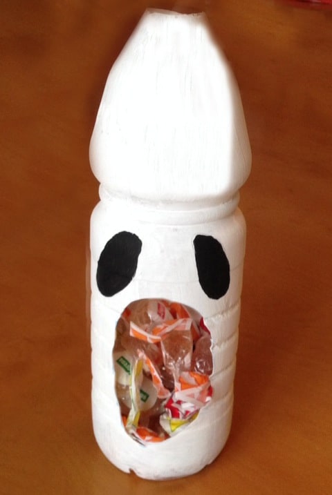 Un’idea per Halloween: un fantasma porta dolcetti e caramelle che i bambini hanno costruito riciclando una bottiglia di plastica. Un riciclo creativo divertente e semplice da fare. Abbiamo eliminato tappo e collo della bottiglia, aperto una grande bocca su un lato e dipinto il nostro fantasma. A questo punto non è restato che riempirlo di caramelle e dolci e partire alla caccia al dolcetto!