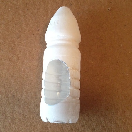 Dipingere la bottiglia di bianco. Se la bottiglia è trasparente, saranno necessario due mani di pittura. Lasciare asciugare.