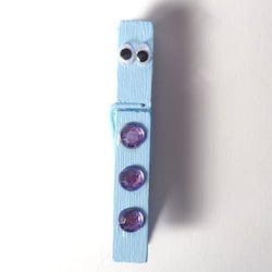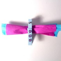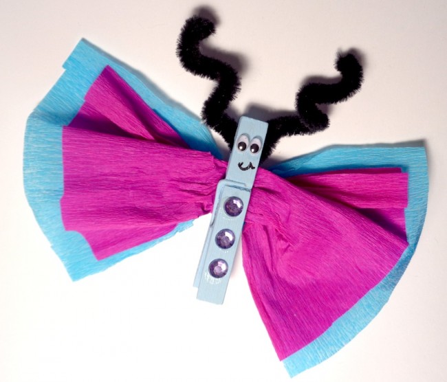 - Con il pennarello nero, disegnare la bocca della farfalla. Inserire (pinzare) lo scovolino/antenne nella molletta e aprire le ali della farfalla.
