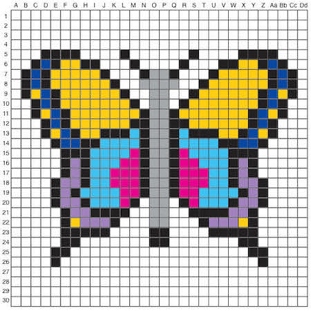 Questa farfalla in pixel art è stata creata per essere semplice e divertente da realizzare. I bambini possono seguire il modello per colorare i quadratini e ottenere un bellissimo disegno.