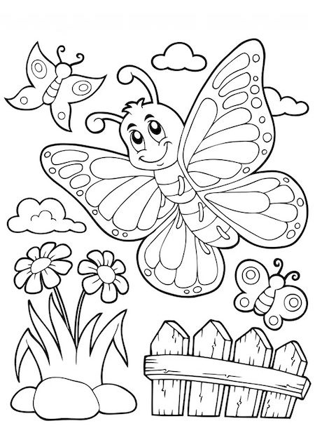 Un disegno di farfalle da colorare per bambini della scuola primaria e della scuola dell’infanzia e da stampare gratuitamente.