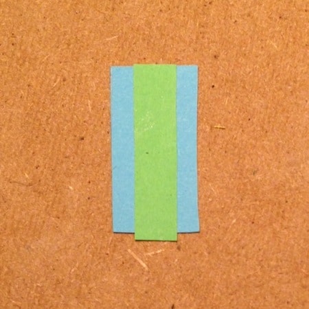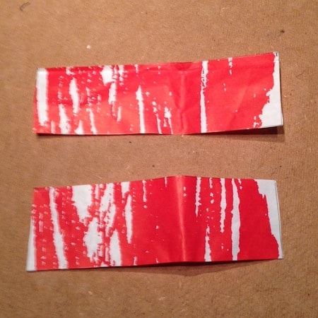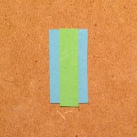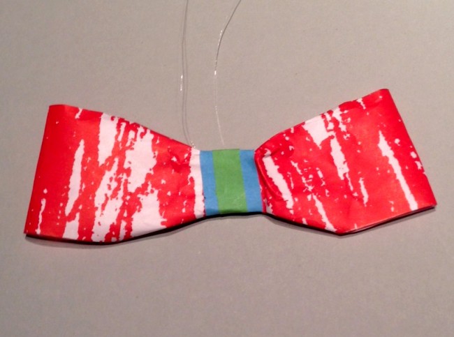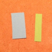 - Capovolgere il rettangolo, sistemare le due “ali” del farfallino al suo centro e aggiungere il filo elastico trasparente. Chiudere la fascia. Incollarla in modo da fissare ali del farfallino ed elastico.