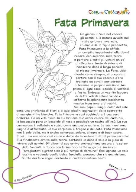 Un giorno il Sole nel vedere gli uomini e la natura avvolti nel triste grigiore invernale, chiama a sé la figlia prediletta, Fata Primavera e le affida un compito importante: ella dovrà recarsi con solerzia sulla terra e portare a tutti gli uomini un po’ di allegria e tanto desiderio di rinascere dopo il lungo periodo di riposo invernale. La Fata, ubbidiente come sempre, si prepara a partire con il suo cocchio d’oro trainato da cavalli per portare a termine la propria missione. Ma prima di ogni cosa, decide di vestirsi a festa. Indossa un vestito leggero di sette veli di colore verde e afferra la splendente bacchetta magica incastonata di rubini. Sui suoi capelli lunghi color del sole pone una ghirlanda di fiori e ai suoi piedini aggraziati delle scarpette di margheritine bianche. Fata Primavera così agghindata è una vera bellezza. Ha un viso ovale su cui brillano due occhi colore del cielo blu, la boccuccia pare un bocciolo di rosa e possiede un nasino all’insù. La sua carnagione è vellutata e rosea come una pesca matura. Le sue mani sono lunghe e affusolate. Il suo corpicino è fragile e delicato. Fata Primavera non è solo bella, ma è anche generosa, solare, allegra e di buon cuore. E poi … ha una voce così calda e dolce da incantare tutti al primo ascolto! Ella finalmente arriva sulla terra, portando in dono il sole e la gioia di vivere agli uomini. Gli alberi al suo arrivo sonnecchiano ancora e la splendida fanciulla li tocca con la sua bacchetta magica e sussurra: “Svegliatevi pigroni! Non è più tempo di dormire!” Essi aprono un solo occhio e vedendo quella dolce fanciulla, pensano che sia una visione, frutto dei loro sogni. Pertanto si riaddormentano beati. Allora Fata Primavera li scuote con un venticello, li chiama con voce più forte. Essi spalancano tutti e due gli occhi e finalmente si rendono conto che non stanno sognando. Si mettono subito all’opera mettendo fuori gemme e fiorellini. Le loro chiome sembrano ora nuvole rosa e bianche di tulle come i vestiti delle spose. La bella Primavera quando cammina sembra danzare, anzi volare, perché i suoi piedini sfiorano appena la terra. Al suo passaggio, sui prati spunta l’erbetta fresca e le margheritine le fanno l’occhiolino. Nei giardini ella fa sbocciare rose e fiori di tanti colori che inebriano l’aria con il loro soave profumo. Con il suo tocco magico poi, scioglie le ultime nevi, cancellando le ultime tracce dell’inverno. La fanciulla ad un certo punto si chiede come mai il bosco sia così silenzioso e solitario. Aguzza l’orecchio e ode il ghiro russare, con gli altri animaletti che fanno coro. Capisce che tutti sono ancora addormentati, sicuri che ancora ci sia fuori il freddo inverno. Allora bussa: “toc, toc”, ad ogni porticina per far sapere a tutti che ormai è tornato il sole e bisogna riprendere il proprio lavoro. Gli animaletti subito si alzano dai lettini, aprono le porte delle loro tane ed esclamano: “Che bello! Finalmente il sole. E’ arrivata Primavera!” Le formichine escono dai formicai e si mettono a marciare in fila indiana, alla ricerca di qualche mollichina. Si odono ronzare le laboriose api che cercano il dolce nettare dei fiori. Vi chiederete: “E le farfalle?” Eccole qua, tutte felici, svolazzano intorno e rivolgono tanti inchini alla dolce fanciulla. Esse poi scappano a giocare a nascondino tra l’erba e sembrano fogli di carta colorati piegati a metà che volano nell’aria. A un certo punto la bella fanciulla nota che manca qualcuno: le rondinelle! Invia allora Saturnina, una colomba bianca, nei paesi caldi ad annunciare loro che il freddo Inverno è andato via e quindi possono ritornare. Appresa la felice notizia, le messaggere della Primavera partono a frotte per tornare al loro paese, desiderose di ritrovare i vecchi amici. Una volta a casa l’aria si riempie di trilli, frullii, cinguettii. Esse giocano a girotondo con Fata Primavera. Tutti finalmente sono felici. Hanno ritrovato l’entusiasmo, la gioia di ricominciare, l’allegria e la serenità. La bella fanciulla ha compiuto un vero miracolo. Prima di ripartire per il cielo, Fata Primavera lascia al mondo un messaggio: La vita è bella! Bisogna avere in cuore la speranza che dopo una tempesta viene il sereno, dopo il buio la luce e dopo ogni Inverno la Primavera. La Primavera! LA PRIMAVERA!