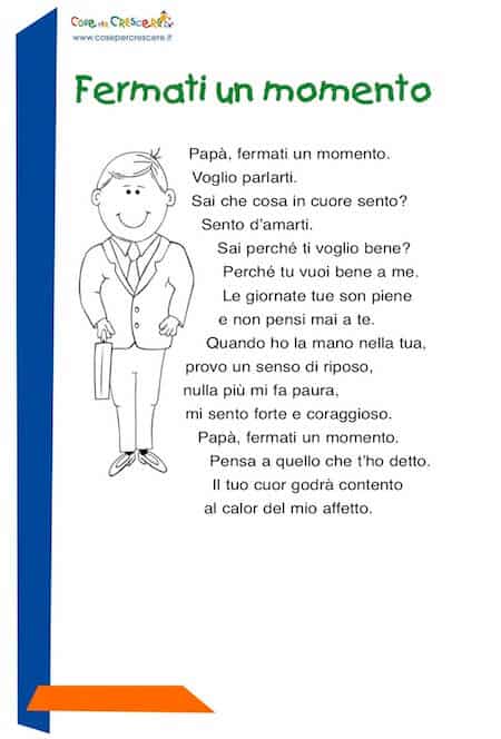 Una poesia da dedicare al papà per dirgli quanto gli vogliamo bene, per il suo compleanno o il 19 marzo giorno della Festa del papà. Per tutti quei papà sempre di corsa e molto impegnati che non riescono mai a fermarsi. Una poesia da stampare gratuitamente e illustrata con un disegno da colorare.