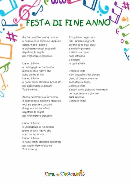 Una canto per la Festa di fine anno scolastico con il testo da stampare. Una canzone da cantare tutti insieme per salutarci prima delle vacanze estive. Per stampare il testo della canzone Festa di fine anno: l’anno è finito, basta scorrere la pagina verso il basso e cliccare sull’immagine dove segnato: si aprirà una seconda finestra con il testo della canzone “Festa di fine anno: l’anno è finito” in formato pdf, pronto per essere scaricato e/o direttamente stampato!