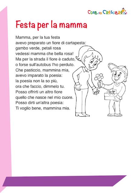 Festa per la mamma è una poesia per bambini tratta da “Giocare per Crescere” (CETEM) da dedicare il giorno della Festa della mamma o per festeggiare il compleanno della mamma. Una poesia facile da imparare, adatta sia ai bambini della scuola primaria che ai bimbi più piccoli che frequentano la scuola dell’infanzia. Una poesia per la mamma che proponiamo sia da leggere online sia in una versione da stampare e illustrata con un disegno da colorare per bambini.