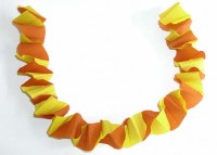 - Ritagliare due strisce di carta crespa colorata di stessa dimensione ma di colori diversi. Per ottenere strisce più lunghe, prepararne altre (dello stesso colore) ed unirle con l’aiuto della pinzatrice.