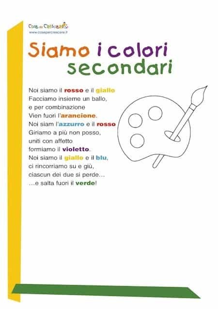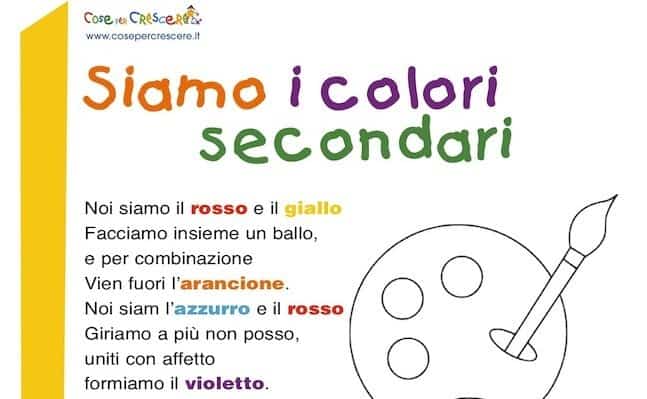 Una filastrocca per aiutare i bambini a memorizzare quali sono i colori secondari, la Filastrocca dei colori secondari. Un testo facile e divertente che proponiamo anche in una versione da stampare, illustrato con un disegno che i bambini potranno divertirsi a colorare, ovviamente, i 3 colori sulla tavolozza dovranno essere… colori secondari!