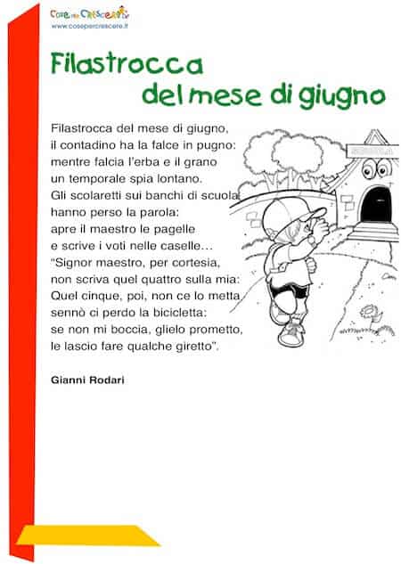 Una filastrocca del mese di giugno, una piccola poesia scritta da Gianni Rodari per salutarci prima dell’inizio delle vacanze estive, una filastrocca per l’ultimo giorno di scuola. Una filastrocca adatta ai bambini che frequentano la scuola primaria da stampare subito e gratuitamente. Come tutte le poesie che proponiamo, la versione da stampare è illustrata con un disegno da colorare!