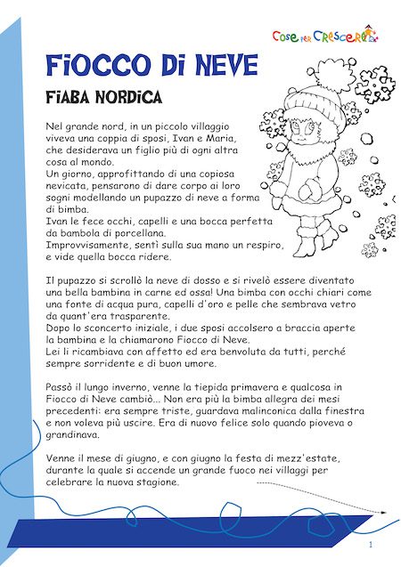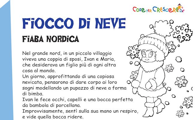 Una storia per bambini che arriva dai paesi nordici. La storia di una bambina nata da un pupazzo di neve… cosa succederà? Un racconto sull’inverno per bambini che abbiamo letto sul web e che proponiamo sia da leggere online sia in una versione illustrata con un disegno da colorare, da stampare gratuitamente. Per stamparla, scorri la pagina verso il basso e segui le istruzioni.