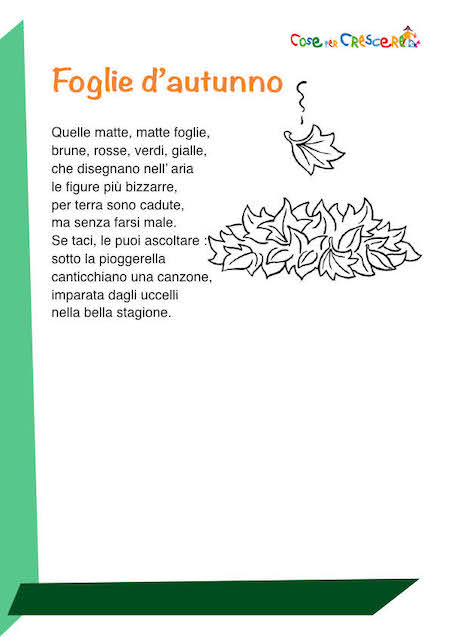 Foglie d’autunno è una poesia per bambini e una dolce e divertente presentazione delle meraviglie di questa stagione affascinante. Con le sue rime giocose e le immagini vivide, è adatta sia ai bambini delle prime classi della scuola primaria sia ai bimbi più grandi della scuola dell’infanzia. Una poesia sull’autunno breve e con parole semplici che la rendono accessibile anche ai più piccoli. Un modo per introdurre i bambini al mondo della poesia! La poesia per bambini è disponibile online per una lettura immediata, ma può anche essere stampata gratuitamente. Inoltre, nella versione da stampare è arricchita con un disegno da colorare che renderà l’esperienza ancora più creativa e coinvolgente per i piccoli lettori.