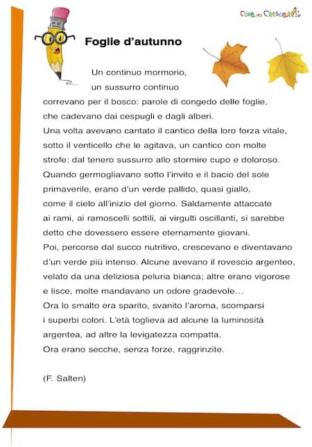 Un testo sull’autunno, scritto da F. Salten, da proporre come dettato nelle classi della scuola primaria. Un dettato con difficoltà ortografiche miste, da stampare gratuitamente e particolarmente adatto ai bambini che frequentano le classi quarta e quinta elementare. Per stampare il dettato, basta scorrere la pagina verso il basso e cliccare sull’immagine dove segnato: si aprirà una seconda finestra con il dettato impaginato in formato pdf da scaricare e/o da stampare direttamente.