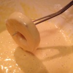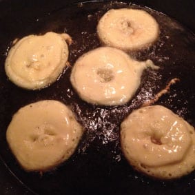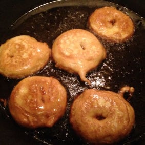 - Quando l’olio sarà caldo, passate le fette di mela nella pastella e fatele dorare nell’olio caldo, rigirandole a metà cottura.