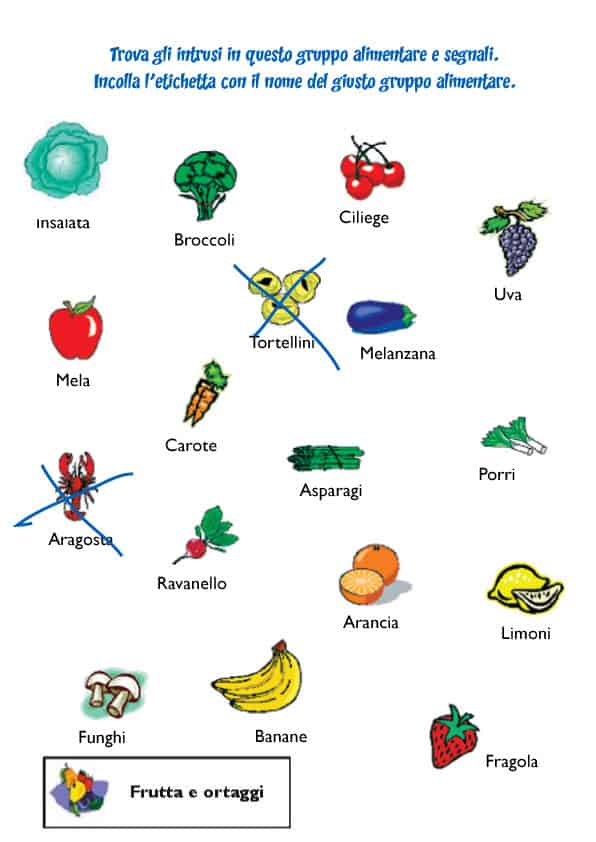 - Chiedete al bambino di ritagliare le etichette dei gruppi alimentari, scegliere quella corretta e incollarla sulla scheda.