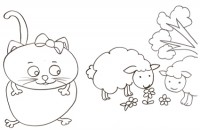 Una tenera gattina che guarda le pecore da stampare e colorare. Questo cucciolo, una dolce gattina con il suo bel fiocco in testa, è molto incuriosita da due pecorelle occupate mangiare dei fiori!