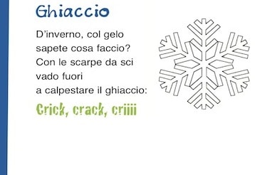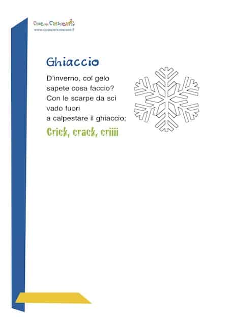 Ghiaccio Una piccolissima filastrocca sull’inverno adatta ai bimbi più piccoli perché corta e facile da imparare. D’inverno, col gelo sapete cosa faccio? Con le scarpe da sci vado fuori a calpestare il ghiaccio: Crick, crack, criiiii FILASTROCCA DA STAMPARE Cliccare sull’immagine per stampare la filastrocca: