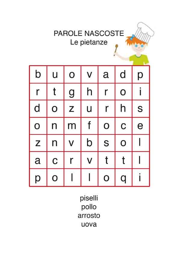 - Cliccare sulla griglia delle parole nascoste sulle pietanze e stamparla.