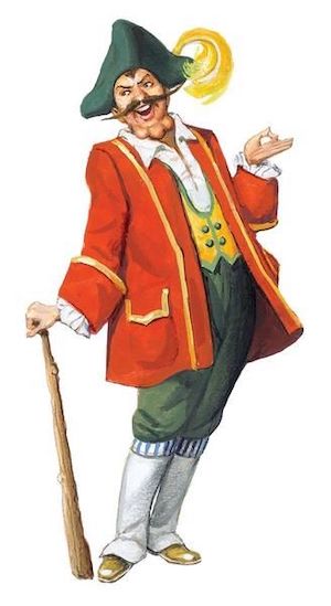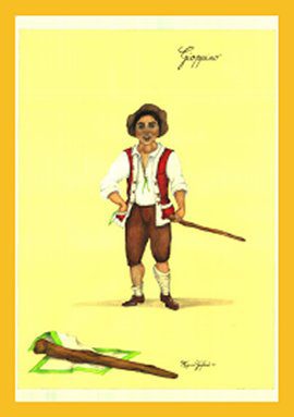 Gioppino indossa un vestito di grosso panno verde orlato di rosso, pantaloni scuri da contadino e un cappello rotondo con una fettuccia volante.