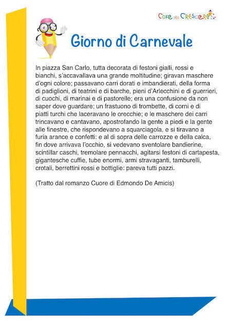 Un testo sul Carnevale tratto dal romanzo per ragazzi Cuore di Edmondo de Amicis, un testo educativo e morale che ha influenzato generazioni di lettori e che proponiamo come dettato ortografico per la scuola primaria. Un testo con difficoltà ortografiche miste, da leggere online e/o da stampare. Per stampare il dettato ortografico, scorri la pagina verso il basso e segui le istruzioni.
