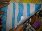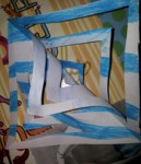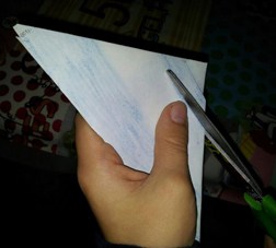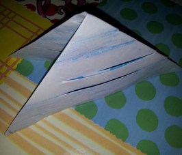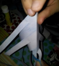 - Ripiegare le parti ritagliate una sopra l’altra (come nell’immagine) e fissarle con un punto di colla.