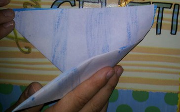- Piegare il quadrato di carta lungo la linea diagonale, mantenendo il disegno (o la decorazione all’interno (formare un triangolo).