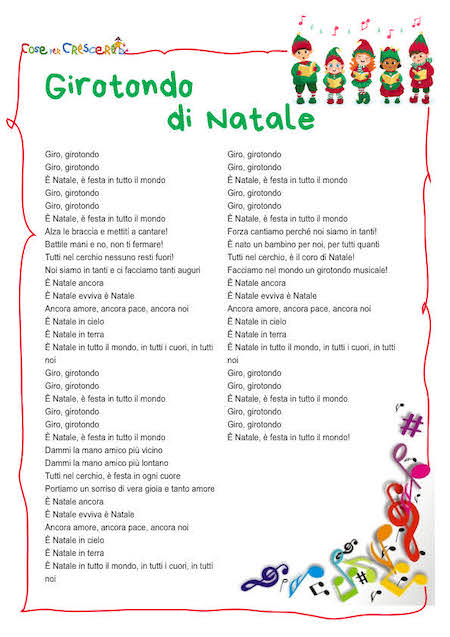 Un canto natalizio per bambini pieno di allegria, da ascoltare, da cantare, una canzone di Natale da ballare tutti insieme! L’invito al “Girotondo di Natale” è un richiamo all’allegria, alla condivisione e alla magia delle tradizioni natalizie. La canzone evoca la magia di guardare il mondo attraverso gli occhi dei bambini, dove ogni dettaglio diventa una scoperta affascinante e ogni suono è un motivo di gioia. È un invito a celebrare il Natale con cuori leggeri, abbracciando la semplicità e la purezza dell’infanzia. Per stampare il testo della canzone Girotondo di Natale, illustrato con un disegno da colorare, basta scorrere verso il basso e cliccare sull’immagine dove segnato: si aprirà una seconda finestra con il testo pronto per essere stampato e/o scaricato.