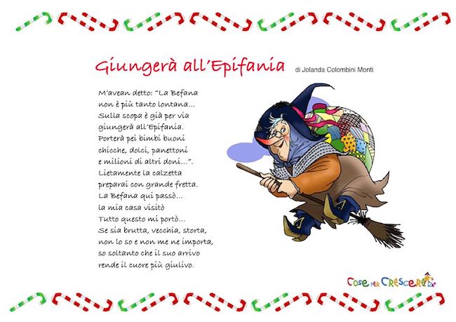 Una bella poesia per il 6 gennaio scritta da Jolanda Colombini Monti, adatta ai bambini che frequentano la scuola primaria. Una poesia per bambini per il giorno della Befana, che proponiamo sia da leggere online che in una versione da stampare gratuitamente. Basta scorrere la pagina verso il basso e cliccare sulla filastrocca dove segnato: si aprirà una seconda finestra, con la poesia pronta per essere scaricata e/o direttamente stampata!