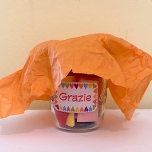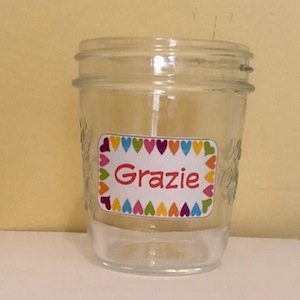 - Scrivi “Grazie” sull’etichetta (o un’altra dedica) e incollala sul vasetto.