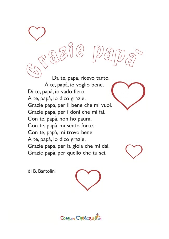 Una dolce poesia da dedicare al papà per la Festa del papà o per il suo compleanno. Grazie papà è una poesia per bambini, scritta da B. Bartolini, che proponiamo in una versione illustrata con un disegno da colorare da stampare gratuitamente. Una poesia tenera e ritmata come una dolce canzone per il papà.