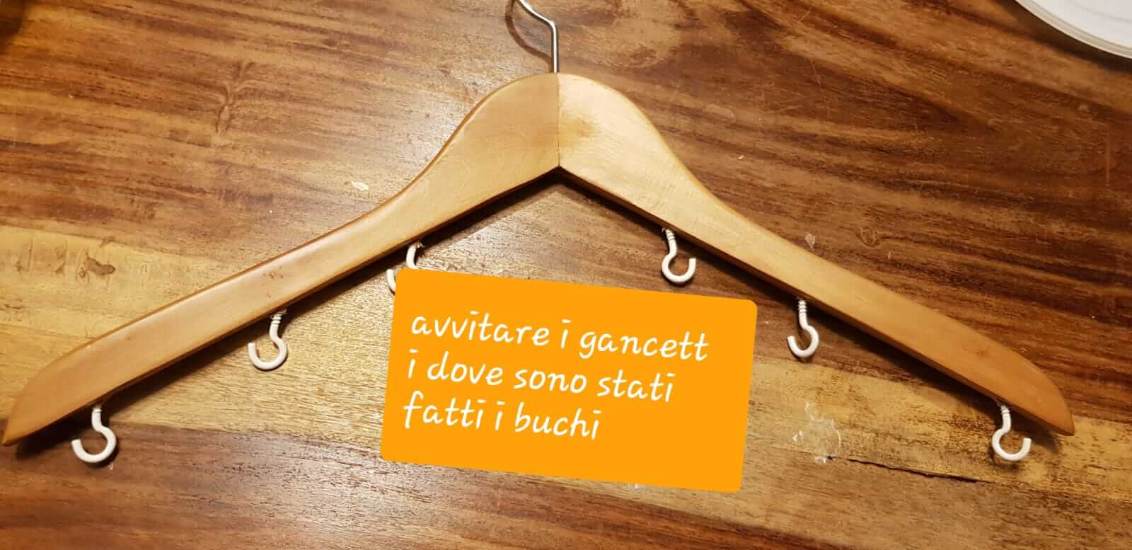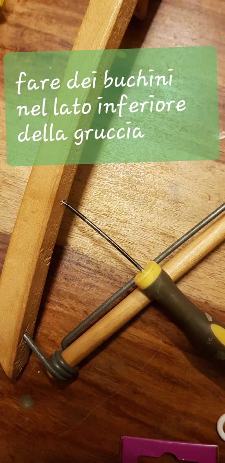 - Con la punta del cacciavite, fare dei buchini nella lato inferiore della gruccia (con la supervisione di un adulto):