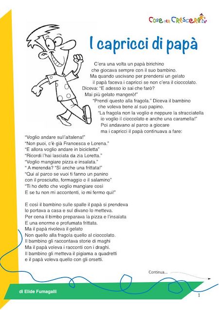 I capricci di papà è una bella storia per bambini scritta da Elide Fumagalli e che ci piace leggere con i bambini. Una storia divertente e originale che i bambini potranno leggere o meglio raccontare al loro papà il 19 marzo in occasione della Festa del papà, che proponiamo sia da leggere direttamente online sia in una versione da stampare e illustrata con un disegno da colorare. Per stampare la fiaba, basta scorrere la pagina verso il basso e cliccare sulla storia dove segnato: si aprirà una seconda finestra con la fiaba per bambini in formato pdf, pronta per essere scaricata e/o direttamente stampata con una normale stampante.