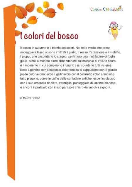 I colori del bosco: dettato sull’autunno adatto ai bambini che frequentano la scuola primaria. Un bel testo scritto da Marcel Roland che ci descrive i meravigliosi colori dell’autunno e i vari funghi che possiamo trovare nei boschi in questa stagione. Un dettato ortografico con difficoltà miste e particolarmente utile ad esercitarsi nell’uso delle doppie.