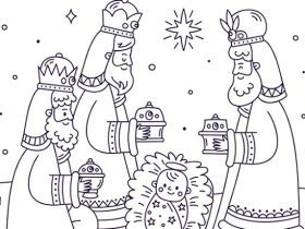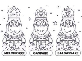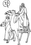 I tre Re Magi, Melchiorre, Gaspare e Baldassare in viaggio verso Gerusalemme, alla ricerca di Gesù Bambino al quale renderanno omaggio e offriranno i loro preziosi doni. In questo disegno due Re Magi sono a cavallo di dromedari, il terzo cammina a piedi.