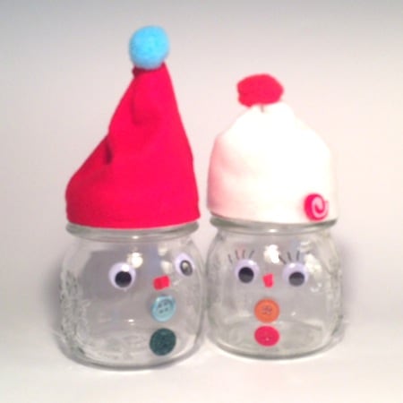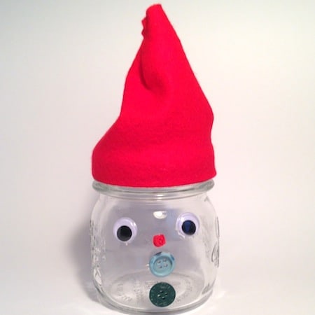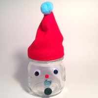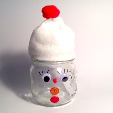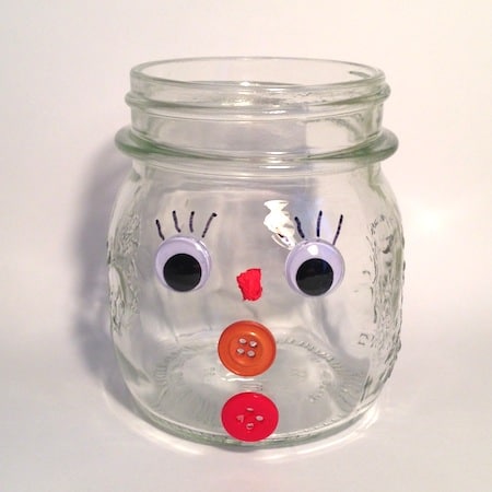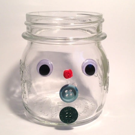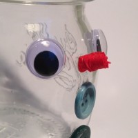 - Incollare gli occhi mobili e i bottoni sul barattolo di vetro. Arrotolare un pezzetto di carta a rossa su se stesso, dandogli la forma di un piccolo naso a punta. Fissarlo con un punto di colla e incollarlo al posto del naso.