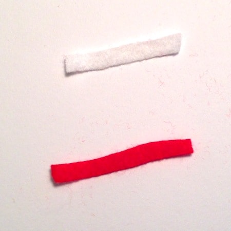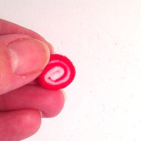 - Ritagliare due sottili strisce di pannolenci bianco e rosso, sovrapporle a arrotolarle come nell’immagine. Incollarle come se fosse un piccolo fiore sul cappello.