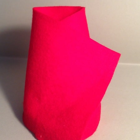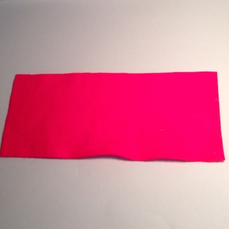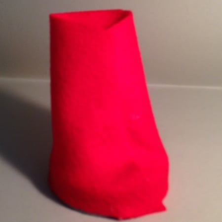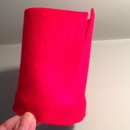 - Ritagliare un rettangolo di pannolenci rosso dalla base un po’ più lunga (circa 1 cm) della circonferenza del tappo. La misura dell’altezza dipende dall’altezza che volete dare al cappello.