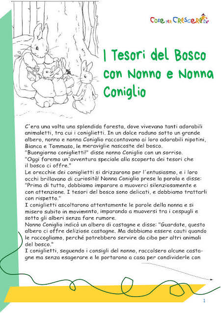 “Buongiorno coniglietti!” disse nonno Coniglio con un sorriso. “Oggi faremo un’avventura speciale alla scoperta dei tesori che il bosco ci offre.”