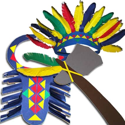 Copricapo, collana e ascia (da fare con il bambino seguendo i nostri tutorial), il trucco giusto, un pantalone beige o marrone, una maglietta a maniche lunghe bastano per realizzare un costume da indiano completo.