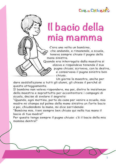 La storia racconta di un bambino che, preservando un gesto d’amore quotidiano della sua mamma, va a scuola con il pugno della mano sinistra sempre chiuso. Questo semplice gesto nasconde un segreto dolcissimo: un bacio della mamma che il bambino vuole custodire durante tutta la giornata. Una storia per la mamma che non è solo un dolce momento di condivisione, ma anche un’occasione didattica per discutere dei sentimenti e del valore delle relazioni familiari. Una lettura ideale per la festa della mamma che proponiamo sia da leggere online sia in una versione illustrata con un disegno da colorare e da stampare gratuitamente. Per stampare la storia per la Festa della mamma, scorri la pagina verso il basso e segui le istruzioni.