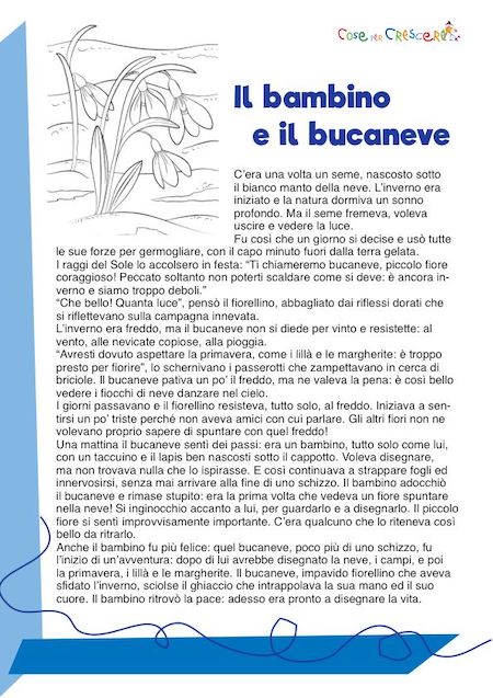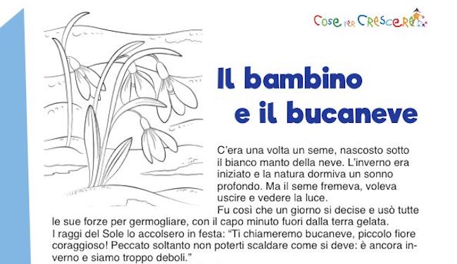Una storia sull’inverno per bambini scritta da Alessia de Falco e Matteo Princivalle che narra di un piccolo bucaneve appena nato e di un bambino. Un bel racconto sull’inverno adatto ai bambini della scuola primaria e a quelli più piccoli che frequentano la scuola dell’infanzia. Una storia per bambini che proponiamo da leggere online e in una versione illustrata con un disegno da colorare e da stampare gratuitamente. Per stamparla, basta scorrere la pagina verso il basso e cliccare dove segnato: si aprirà una seconda finestra con la storia in formato pdf da scaricare e/o stampare.