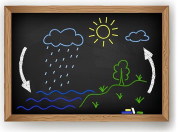 L’acqua degli oceani, dei laghi e dei fiumi, riscaldata dal sole, si evapora. Anche le piante, che traspirano, producono del vapore acqueo! Tutta quest’acqua evaporata, si eleva, si raffredda e forma delle nuvole che, spinte dal vento, si spostano percorrendo molti chilometri. Durante il loro viaggio, queste nuvole incontrano diverse temperature che, a seconda del loro grado, le trasformano in pioggia, neve, grandine, rugiada o nebbia. E così, il ciclo si ripete…