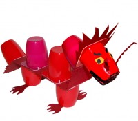 - In un foglio di carta nera (o di carta bianca colorata) disegnare e ritagliare occhi, sopracciglia, narici, bocca e corna. Incollare tutto sulla testa del drago. Rinforzare il collo del drago, incollando una linguetta di cartoncino tra i vasetti della nuca e della schiena.